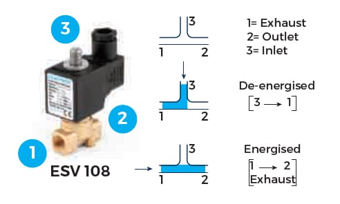 3/2 NO mosaz 1/8″–1/4″ vzduch/voda, s přímým ovládáním, řada ESV 108..