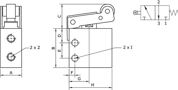 3/2cestný mikroventil s pákou a kladkou, monostabilní, s nastavením se zpětnou pružinou