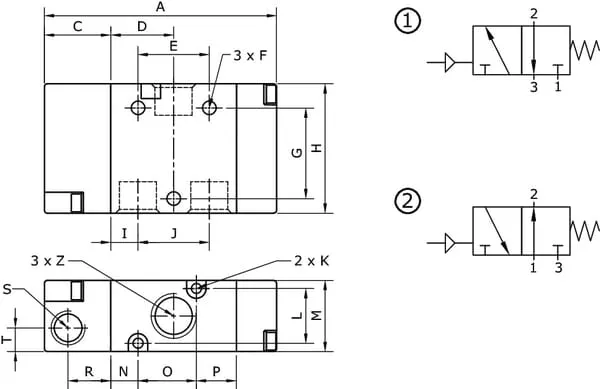 3/2cestný pneumatický ventil, monostabilní s nastavením se zpětnou pružinou
