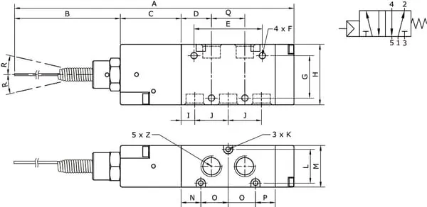 5/2cestný anténní ventil, monostabilní s nastavením se zpětnou pružinou