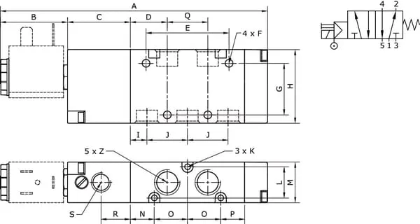 5/2cestný magnetický ventil, monostabilní s nastavením se zpětnou pružinou, se servořízením
