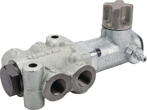 • S brzdovými ventily BV201128MN je možné brzdit přívěs pomocí čerpadla traktoru (max. 55 l/min). Pomocí redukčního ventilu (tlačítko na ventilu) je možné nastavit maximální brzdný tlak do brzdového válce. Brzdový ventil je ovládán brzdovým systémem traktoru. Brzdy lehkých přívěsů se nezablokují.