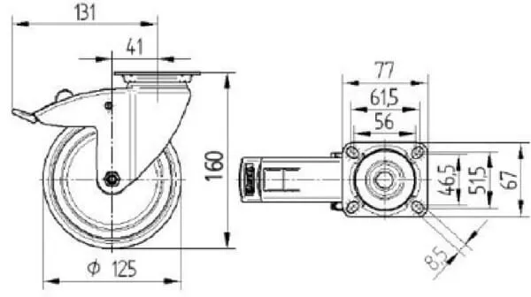| Technická informace | Otočné kolečko s totální brzdou, v zadní části kola, Vidlice vyrobena z ocelového výlisku, pozinkováno, dvojité kuličkové ložisko v otočné hlavě, kolečko se šroubem a maticí, uchycení s plotýnkou. Střed kolečka vyroben z polypropylénu, Běhoun: TENTEprén (termoplastická guma), šedá-neznačkující, protivláknový kryt, přesné kuličkové ložisko , s protivláknovými kryty |