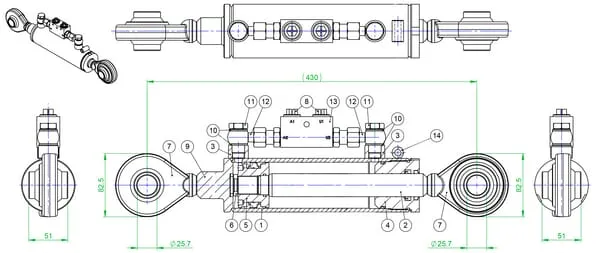 Hydr toplink cat 2/2, with valve, pin holes, with extended rod end