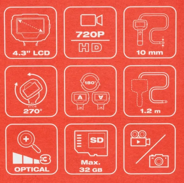| Popis výrobku | Digitální inspekční kamera Milwaukee s obrazovkou otočnou o 270° zajišťuje plynulé ovládání obrazu v jakékoli poloze. Velká 4,3″ LCD obrazovka poskytuje ostrý a jasný obraz a umožňuje uživatelům zobrazit objekty ve větším detailu. |