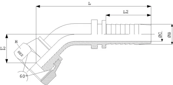 | Popis výrobku | Koncovka pro výrobu hadice z ušlechtilé oceli DKR/PF 45° převlečná matice BSP s těsnicí hlavicí 60° |