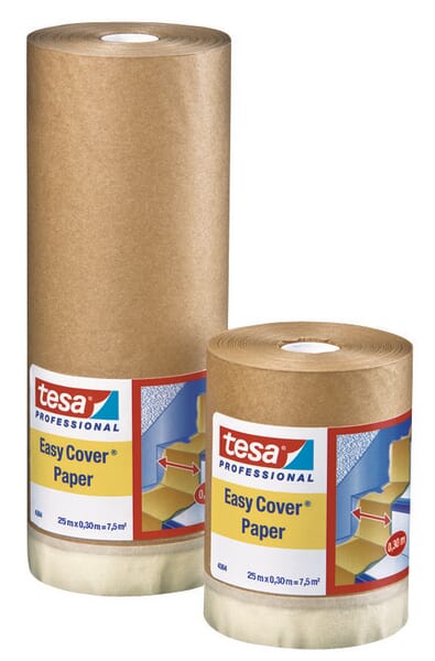 | Popis výrobku | Krycí papír s maskovací páskou EasyCover® 4364 se skvěle hodí k rychlému zakrývání velkých ploch. Je kombinací speciálně skládaného kvalitního papíru a maskovací pásky a vyznačuje se odolností vůči disperzním nátěrům, jako jsou latexové barvy na vodní bázi. Tento krycí papír s maskovací páskou byl úspěšně testován při všech standardních situacích ve vnitřních prostorách. Po krátké době jej lze snadno odstranit, aniž by na povrchu zůstávaly zbytky lepidla. Maskovací pásku lze nalepit velmi přesně, takže rovné povrchy (např. podlahové lišty, parapety, okenní rámy, zárubně apod.) jsou chráněny proti odkapávání a stékání barvy. |