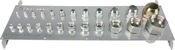 Popis výrobku Usnadňují identifikaci správných hydraulických spojek a velikostí závitů. Každá deska obsahuje prohlubně, do kterých lze namontovat jak vnitřní, tak vnější spojky. V případě pochybností lze spojku, kterou je třeba vyměnit, rychle a přesně namontovat a porovnat. Tyto identifikační pomůcky jsou k dispozici buď jako samostatné desky nebo s již smontovanými spojkami. K dispozici jsou také praktické nožičky, které umožňují pohodlné umístění na pracovní pult nebo ponk.