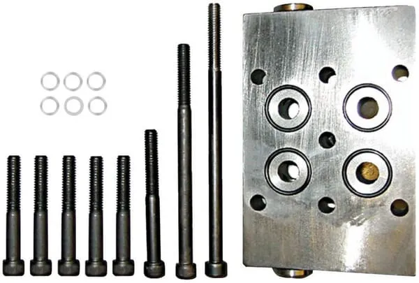 Technická informace Tato vložená deska se namontuje mezi blok pro odtrhávací spojku a řídicí ventil Rexroth. Pomocí této desky je možné přípojky spotřebičů k řídicímu zařízení ještě jednou rozdvojit pro další, dvojčinné spotřebiče.