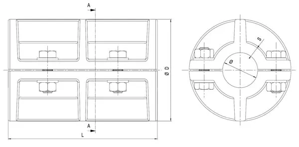 Lze použít v mnoha oblastech | Sit | Kus | Litina GG25 | Pohony s přenosem velkého točivého momentu | Odolné proti axiálním, radiálním a rázovým zatížením | 158 mm | 4 | 49 N·m | 35 mm | 103 mm | Hřídele musí být před montáží dobře vyrovnány | 2226 r/min | M10 | 80 N·m | 40 N·m | |