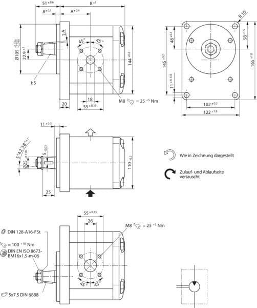45 cm³/rev | Německý | Zkosený | Boční | 250 BAR | 2600 r/min | 500 r/min | 4 | 180 BAR | 55 mm | 55 mm | Pravotočivé (CW) | Standardní | 1:5 (25×25) | 105 mm | 45 cm³/rev |