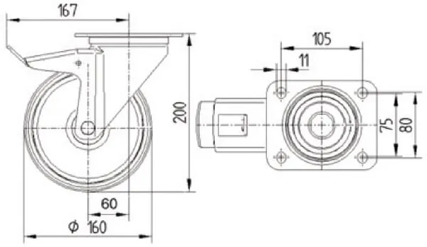 | Technická informace | Otočné kolečko s totální brzdou, v zadní části kola, Vidlice vyrobena z nerezové oceli, dvojitá kuličková dráha v otočné hlavě kolečka, kolo se šroubem a maticí , uchycení s plotýnkou. Střed kola vyroben z polyamidu, vysoké zatížení, kluzné uložení, Běhoun: polyuretan, purpurově červený, jehlové ložisko, nerez |