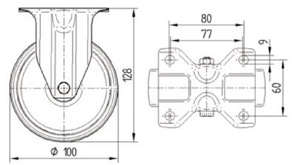 • Pevné kolečko, Vidlice vyrobena z nerezové oceli, kolo se šroubem a maticí, uchycení s plotýnkou.
