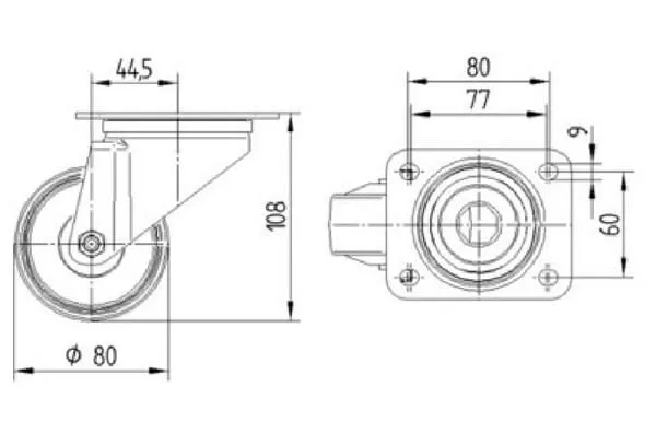 | Technická informace | Otočné kolečko, Vidlice kolečka vyrobena z ocelového výlisku, pozinkováno, dvouřadá kuličková dráha v otočné hlavě, kolo uchyceno šroubem a matkou, protivláknový kryt, uchycení s plotýnkou. Střed kola vyroben z polyamidu, jehlové ložisko |