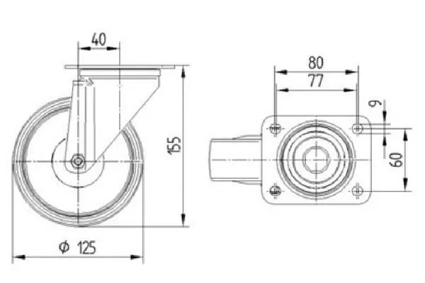 | Technická informace | Otočné kolečko, Vidlice kolečka vyrobena z ocelového výlisku, pozinkováno, dvouřadá kuličková dráha v otočné hlavě, kolo uchyceno šroubem a matkou, protivláknový kryt, uchycení s plotýnkou. Střed kola vyroben z polyamidu, jehlové ložisko |