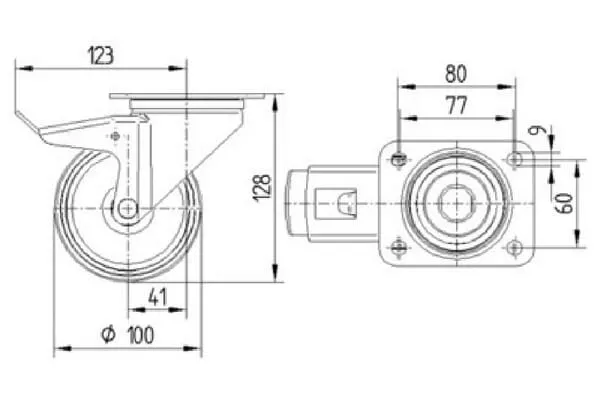 | Technická informace | Otočné kolečko s totální brzdou, v zadní části kola, Vidlice kolečka vyrobena z ocelového výlisku, pozinkováno, dvouřadá kuličková dráha v otočné hlavě, kolo uchyceno šroubem a matkou, protivláknový kryt, uchycení s plotýnkou. Střed kola vyroben z polyamidu s protiváknovým krytem, jehlové ložisko |