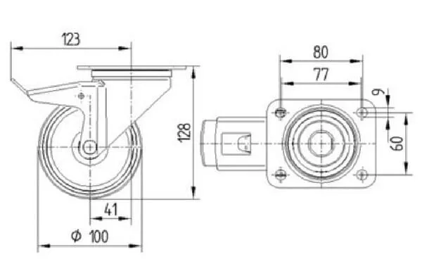 | Technická informace | Otočné kolečko s totální brzdou, v zadní části kola, Vidlice kolečka vyrobena z ocelového výlisku, pozinkováno, dvouřadá kuličková dráha v otočné hlavě, kolo uchyceno šroubem a matkou, otvor pro čep. Střed kolečka vyroben z polypropylénu, Běhoun: gumová obruč, šedá neznačkující, jehlové ložisko |