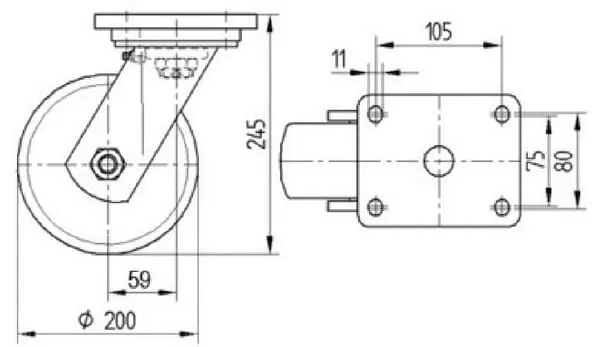 | Technická informace | Otočné kolečko, Vidlice a plotna ze svařované oceli, zinkochromát, utěsněné ložisko s dvojitým speciálním kuličkovo-kuželovým ložiskem, snýtováno pevným nýtem a samojistnou zajištěnou maticí, maznice, kolo se šroubem a maticí, uchycení s plotýnkou. Střed kola vyroben z polyamidu, vysoké zatížení, přesné kuličkové ložisko |