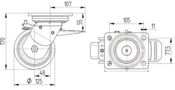 | Technická informace | Otočné kolečko s totální brzdou, hlava nahoře kola, Vidlice a plotna ze svařované oceli, zinkochromát, utěsněné ložisko s dvojitým speciálním kuličkovo-kuželovým ložiskem, snýtováno pevným nýtem a samojistnou zajištěnou maticí, maznice, kolo se šroubem a maticí, uchycení s plotýnkou. Střed kolečka vyroben z litiny, Běhoun: polyuretan, odlévaný, přesné kuličkové ložisko |