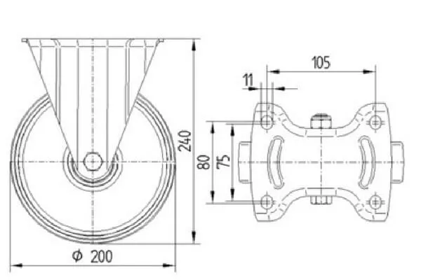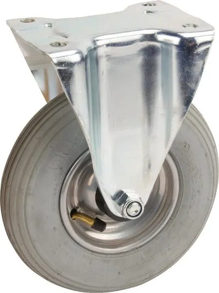 • Pevné kolečko, Vidlice vyrobena z ocelového výlisku, pozinkováno, kolo uchyceno středovým šroubem s maticí, uchycení s plotýnkou.