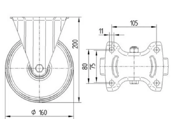 • Pevné kolečko, Vidlice vyrobena z ocelového výlisku, pozinkováno, kolo uchyceno středovým šroubem s maticí, uchycení s plotýnkou.