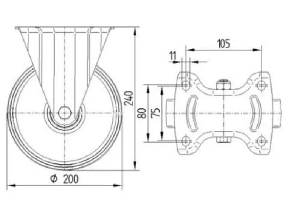 • Pevné kolečko, Vidlice vyrobena z ocelového výlisku, pozinkováno, kolo uchyceno středovým šroubem s maticí, uchycení s plotýnkou.