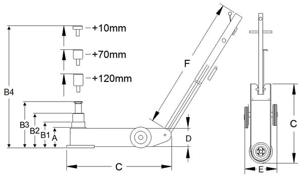 | Extra info | Tento zvedák je vybaven pružinovým spouštěcím systémem a spínačem bdělosti. Díky nízké konstrukci jej lze použít i v nižších polohách. Dodává se se třemi prodlužovacími díly (10, 70 a 120 mm). |