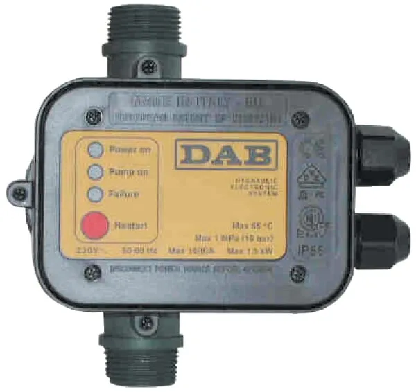 Pojistka proti chodu nasucho | DAB | Kus | 16 A | 2,2 kW | Vypíná, když není průtok a je dosaženo maximálního tlaku čerpadla | 240 | 10 BAR | 65 | 009010056 |