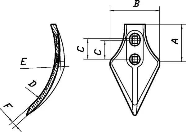 Radlice kultivátoru 235x120x9 mm, tvrzená, zahnutá, 2 otvory, vhodná pro Peecon