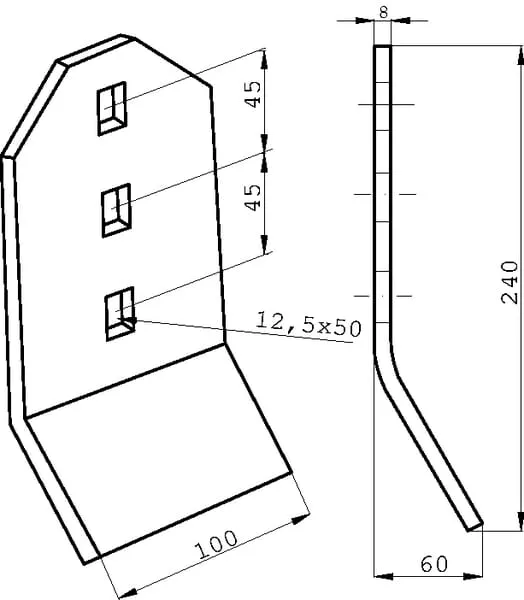 Radlice kultivátoru 240x100x8 mm, tvrzená, plochá, 3 otvory, vhodná pro Väderstad