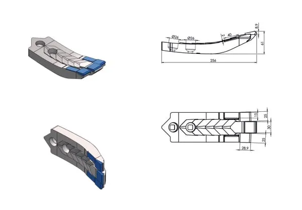 Radlice kultivátoru 256×80 mm tvrzená, zahnutá, 2 otvory, vhodná pro Agrisem