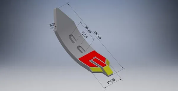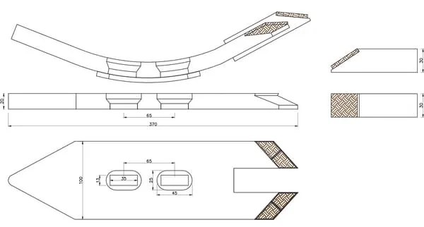 Radlice kultivátoru 370x100x20 mm, tvrzená, zahnutá, 2 otvory, vhodná pro Farmet