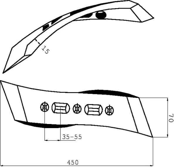 Radlice kultivátoru 450x70x15 mm, otočná left tvrzená, zahnutá, 5 otvorů, vhodná pro Väderstad