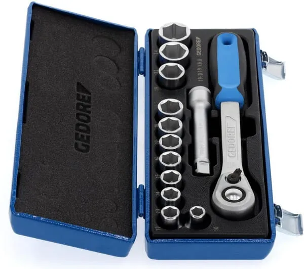 | Popis výrobku | Sada nástrčných klíčů 1/2″ s kovanými, kalenými 6hrannými (č. 19) nebo 12hrannými (č. D 19) nástrčnými klíči profilu UD. |
