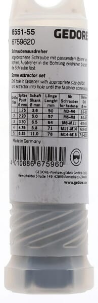 Použití Pro odstraňování odlomených šroubů, čepů a závitových tyčí