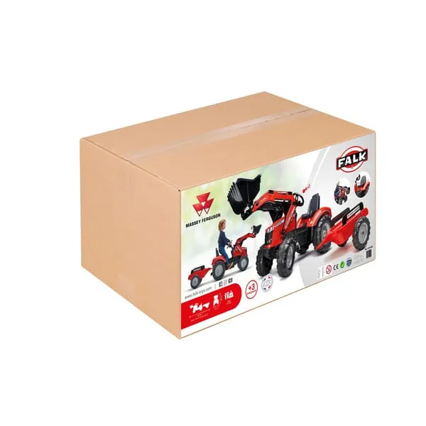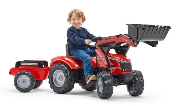 Popis výrobku Šlapací traktor Massey Ferguson, model S8740, s čelním nakladačem, zadní výkopovou lžící a přívěsem
