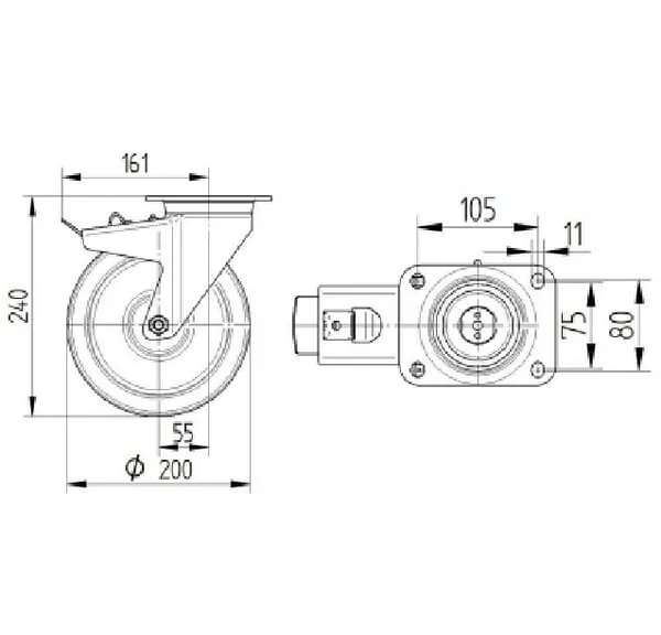| Technická informace | Otočné kolečko s totální brzdou, v zadní části kola, Vidlice vyrobena z velmi siného ocelového výlisku, zesíleno, modře zinkováno, utěsněná zesílená dvouřadá kuličková dráha v otočné hlavě kola, tepelně zpracovaný povrh kuliček, zanýtováno masivním nýtem, kolo se šroubem a maticí, uchycení s plotýnkou. Střed kolečka vyroben z hliníkové slitiny, Běhoun: polyuretan, odlévaný, přesné kuličkové ložisko |