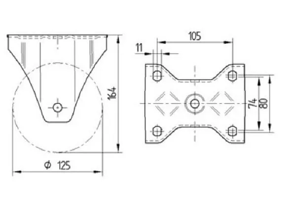 • Pevné kolečko, Vidlice vyrobena ze zesíleného ocelového výlisku,zpevněno, modře zinkováno, kolo se šroubem a maticí, uchycení s plotýnkou.