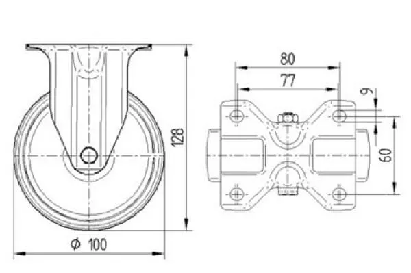 • Pevné kolečko, Vidlice vyrobena ze zesíleného ocelového výlisku,zpevněno, modře zinkováno, kolo se šroubem a maticí, uchycení s plotýnkou.