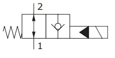 Popis výrobku Normálně otevřený, předem aktivovaný elektromagnetický ventil. V nenapájeném stavu je volný průtok v obou směrech. Za provozu je průtok z 2 do 1 zavřený a z 1 do 2 je volný.