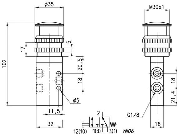 Ventil 3/2-cestný, s tlačítkem