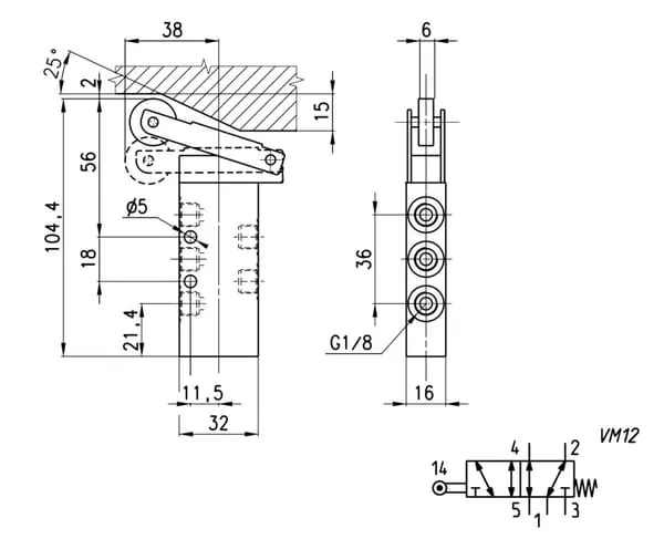 Ventil 5/2-cestný, s válečkovou pákou