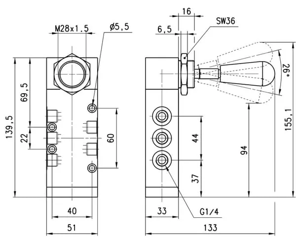 Ventil 5/3, ruční pákový