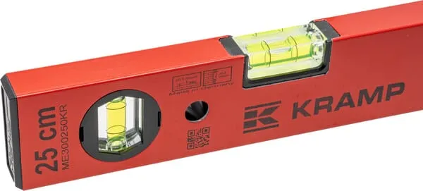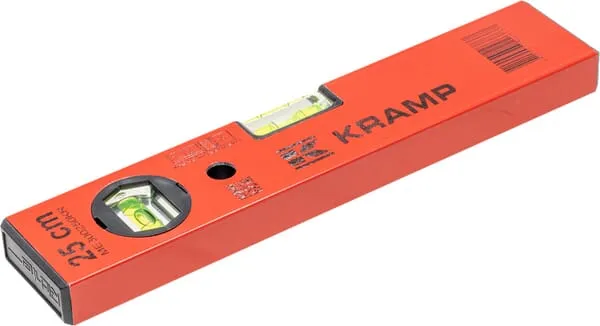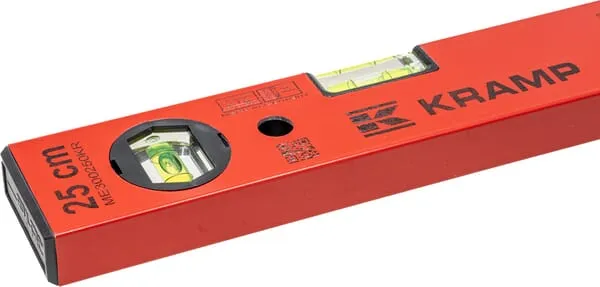 Popis výrobku Vodováhy Kramp s vodorovnou a svislou trubičkou s kapalinou ve tvaru soudku z nerozbitného akrylového skla, které jsou pevně přilepeny v těle vodováhy.