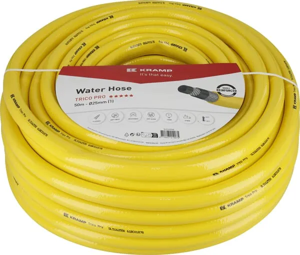 • Hadice na vodu určená k intenzivnímu a profesionální použití při zavlažování a čištění v zemědělství, stavebnictví a průmyslu. Jedinečná kombinace výpletu a křížové výztuže zajišťuje vysokou odolnost proti ohybům, uzlům a tlaku. Hadice je vyrobena z PVC, které neobsahuje ftaláty, kadmium, baryum ani olovo, vyznačuje se výjimečnou odolností proti UV záření a opotřebení a zachovává si pružnost i při nízkých teplotách. Pětivrstvá struktura s dvojitým vyztužením: výplet + křížová výztuha; vnitřní vrstva: černé PVC (odolné proti řasám), střední vrstva: černé PVC, vnější vrstva: žluté PVC