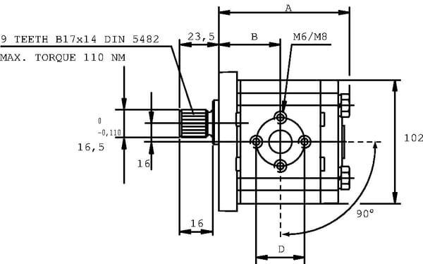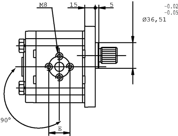 14,53 cm³/rev | Evropský | E2 | 4 | Drážkované 9T | 12 | 16,5 mm | n/a | n/a | 9 | n/a | Standardní | 250 BAR | 280 BAR | 300 BAR | 3500 r/min | 500 r/min | Levotočivé (CCW) | 71,5 mm | 96,2 mm | Boční | 107,5 mm | Hliník | Litina | 51 mm | 30 mm | 40 mm | 35,5 mm | 2 | +European 4-hole flange | +Pump housing: Aluminium- Flange and back cover: Steel | +Spline-shaft (DIN 5482). |